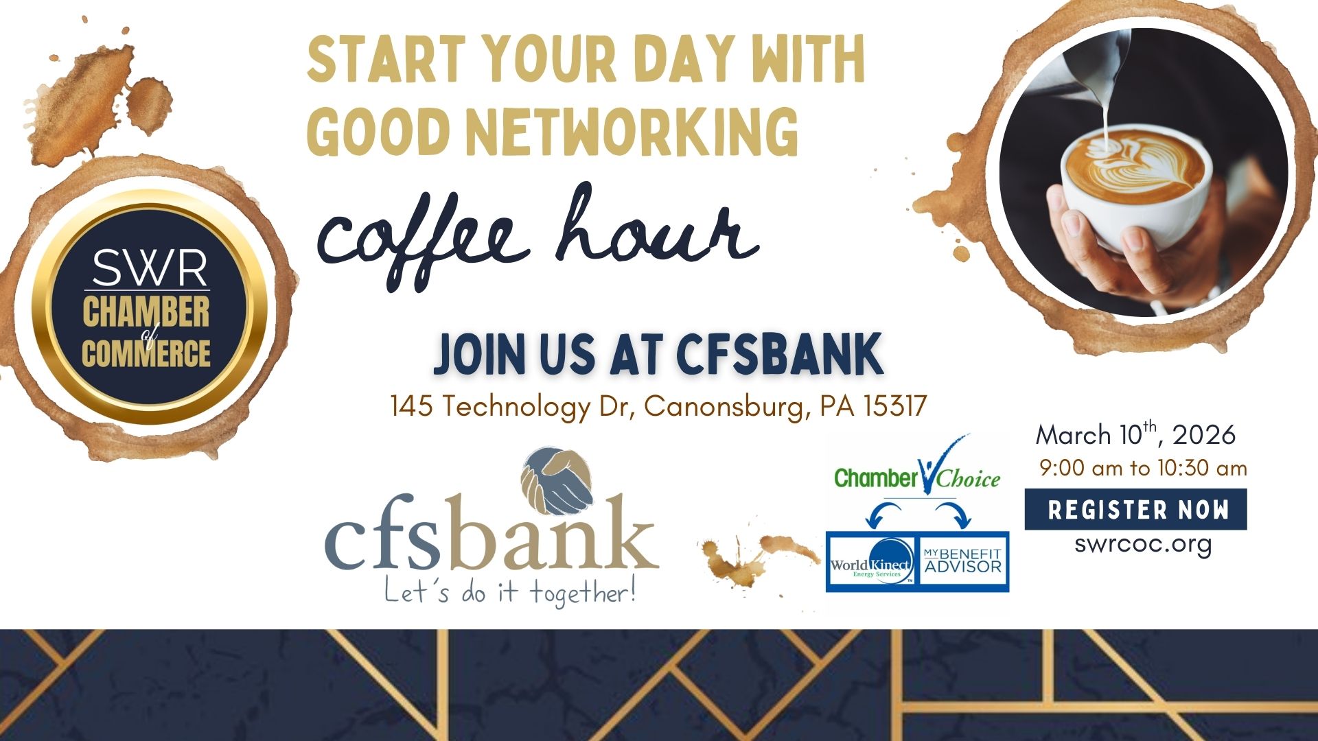 Join the South West Regional Chamber of Commerce for Coffee Hour at Coffee Hour at cfsBank in Southpointe on March 10th, 2025 from 9:00-10:30.