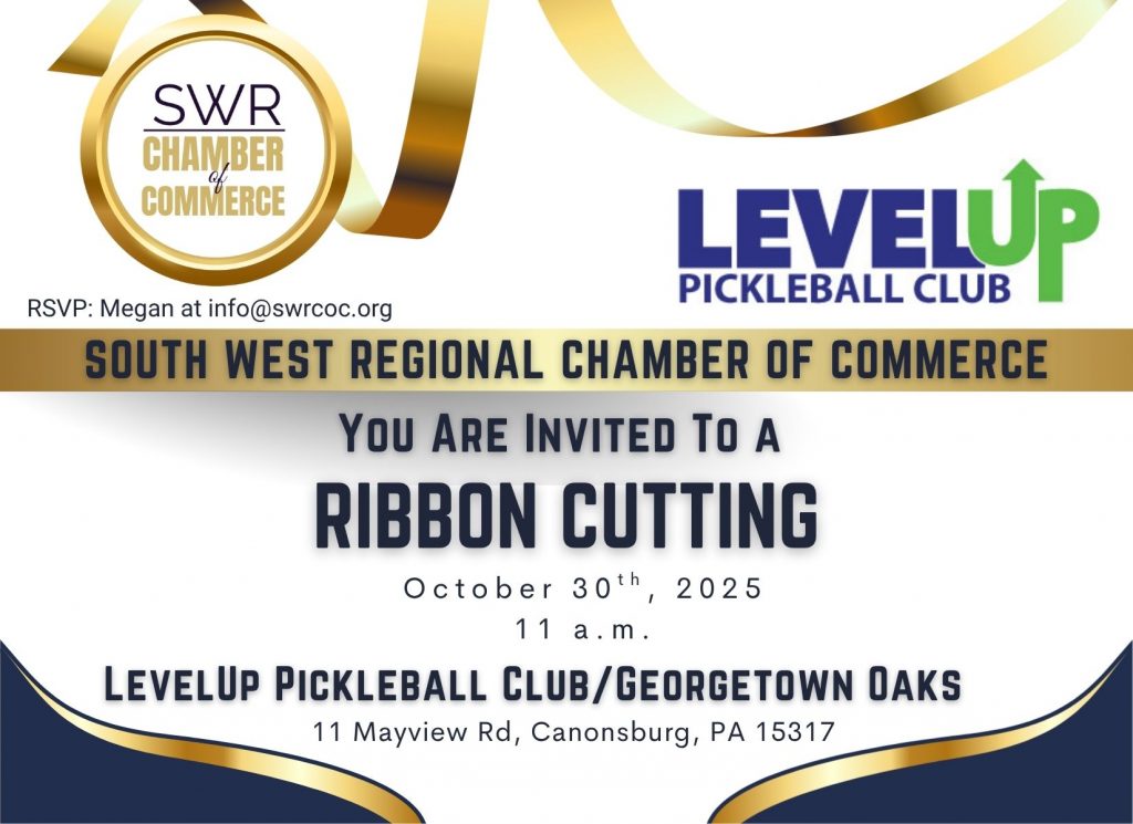 Join the South West Regional Chamber of Commerce for a ribbon cutting at LevelUp Pickleball Club/ Georgetown Oaks on October 30th, 2025 at 11 a.m.!