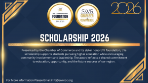 Each year, when possible, the SWRCC awards one scholarship to a qualified high school senior from each of the school districts served by the Chamber. Through this program, we’re investing in individual futures and building stronger communities by empowering the leaders of tomorrow. We look forward to helping local students pursue their dreams, achieve their goals, and ultimately return to contribute to the communities that supported them.